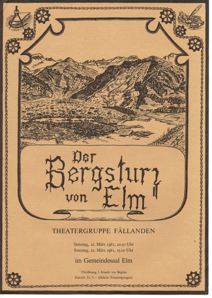 Das StückEs ist ein Rührstück im Stil der Schicksalsdramen des ausgehenden 19. Jahrhunderts: durch ihre Sündhaftigkeit verursachen die Bösen im Stück den Elmer Bergsturz, verhindern aber auch das Glücklichwerden der andern, die gut und gottesfürchtig sind. Der Bergsturz als Strafe, als Mahnung. Durch das Umglück gehen den Figuren im Stück die Augen auf, sterbend bereuen sie ihre Taten und suchen, dort wo es noch möglich ist, wieder gutzumachen.